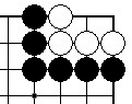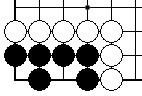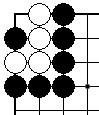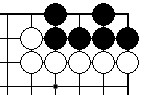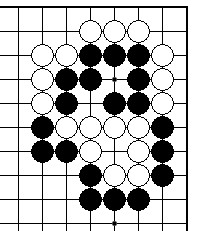 左图是“无眼双活”之形,双方的棋子连一只“眼”都没有,但又都不是死棋。这是因为在双方两块被围困的棋子中间,正好存有两口“公气”。此时,任何一方又都不敢在这两口“公气”中的任何一处下子,否则,自己的一块棋反要被对方吃掉。