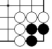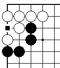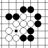 右图是“有眼双活”之形,相互围困的黑白两块棋各自只有一只“眼”,但巧的是,在这两块棋之间,正好有一口“公气”。此时,谁要是贪心的想通过把子下在“公气”上去“叫吃”对方,则自己的棋子也将“没气”了,反而要被对方吃掉。所以,双方在此处都只能明哲保身。