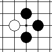 以上定义中所提到的“眼”,是围棋对局中最常用到的专用术语之一。所谓“眼”,实际上就是棋盘上被某一方用棋子围住的一处空白交叉点,如下图。