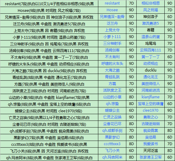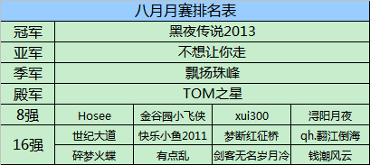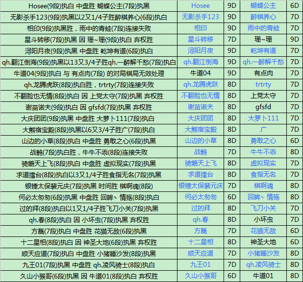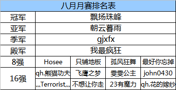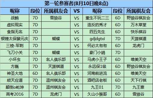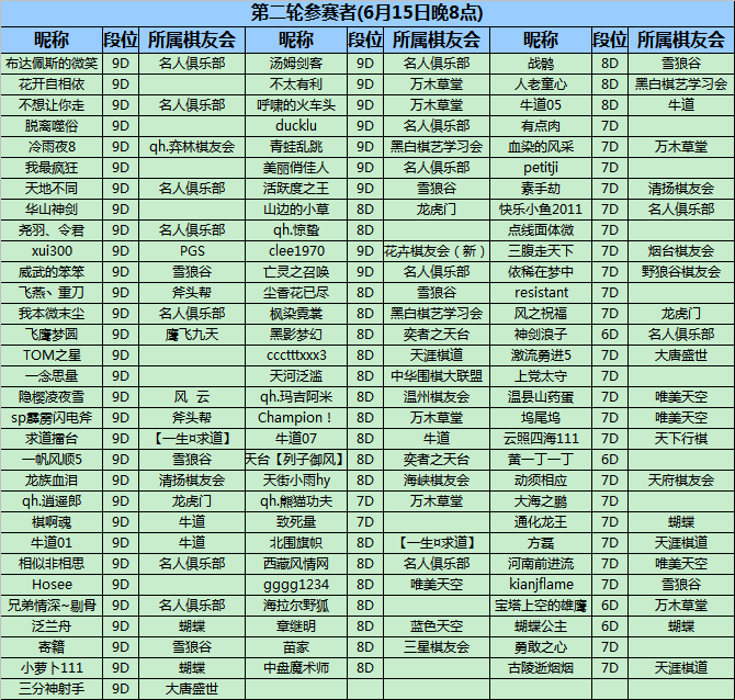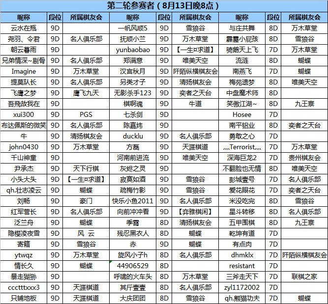 经过7天的报名7号晚8月月赛报名已经结束。共有116位玩家成功报名,7月棋魂高段对局积分榜前8名的棋手将直接进入32强(积分榜前8位里有未报名参加月赛的将依次向后顺延),有24人将参加1日晚上的第1轮,84人参加11日晚上的第2轮,32强战在8月15日晚8点拉开序幕。又是一番黑白大战值得期待,以下是本月月赛的报名情况和赛程安排。