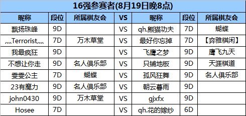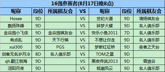 第五轮 8月17日 (周3)20:00 (16强赛)