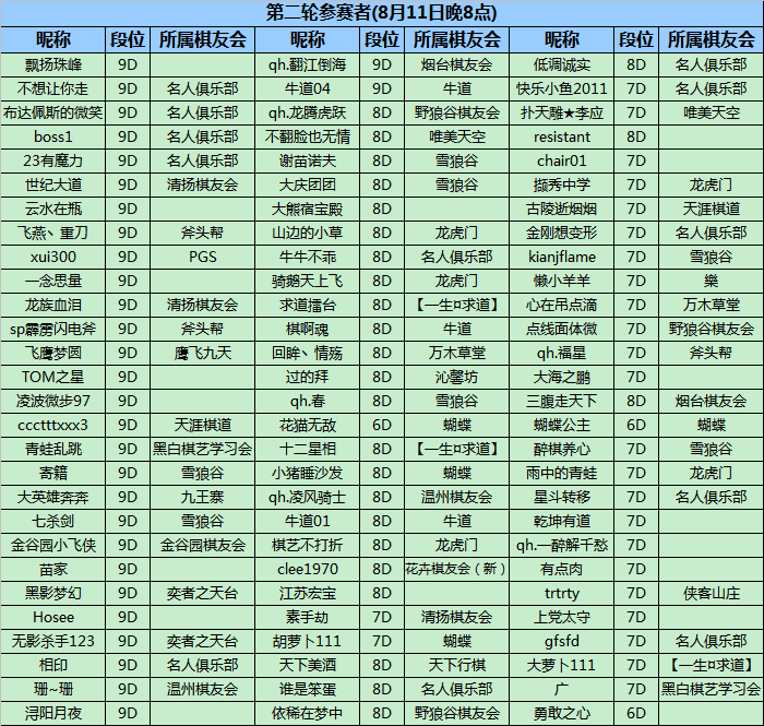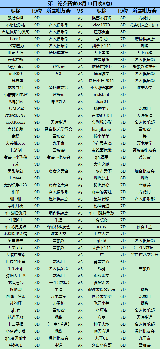 第二轮 8月11日 (周4)20:00 (第二轮)