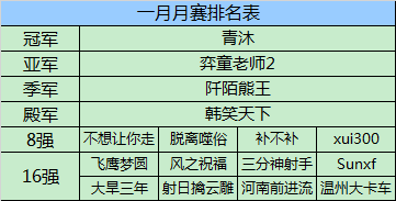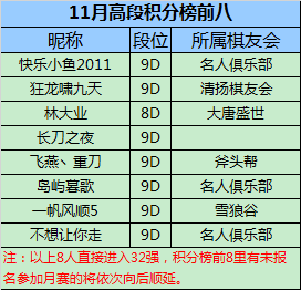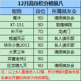 经过7天的报名7号晚1月月赛报名已经结束。共有101位玩家成功报名,12月棋魂高段对局积分榜前8名的棋手将直接进入32强(积分榜前8位里有未报名参加月赛的将依次向后顺延),有90人将参加11日晚上的第1轮,3人参加12日晚上的第2轮,32强战在1月13日晚8点拉开序幕。又是一番黑白大战值得期待,以下是本月月赛的报名情况和赛程安排。