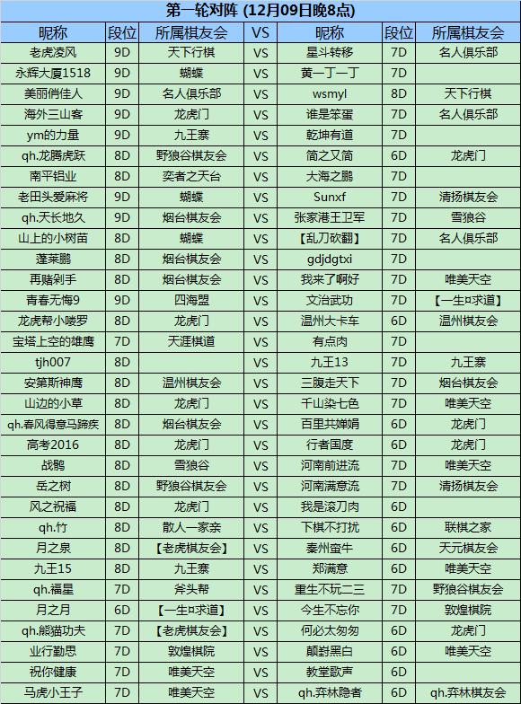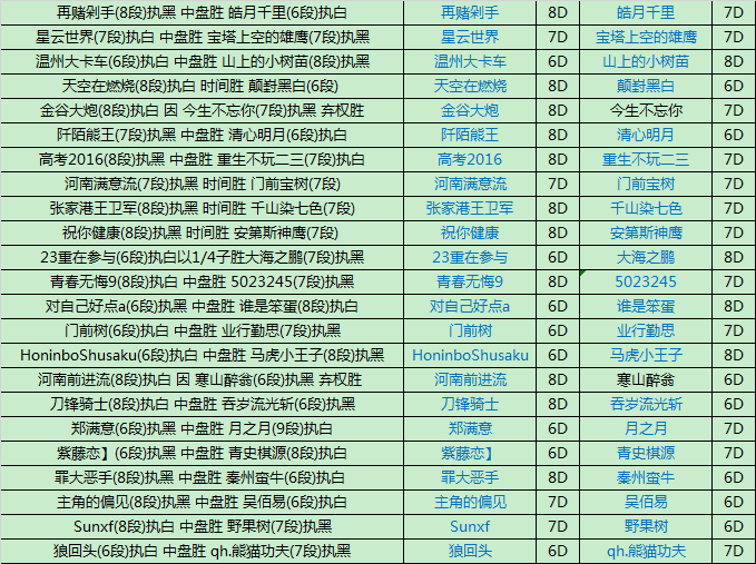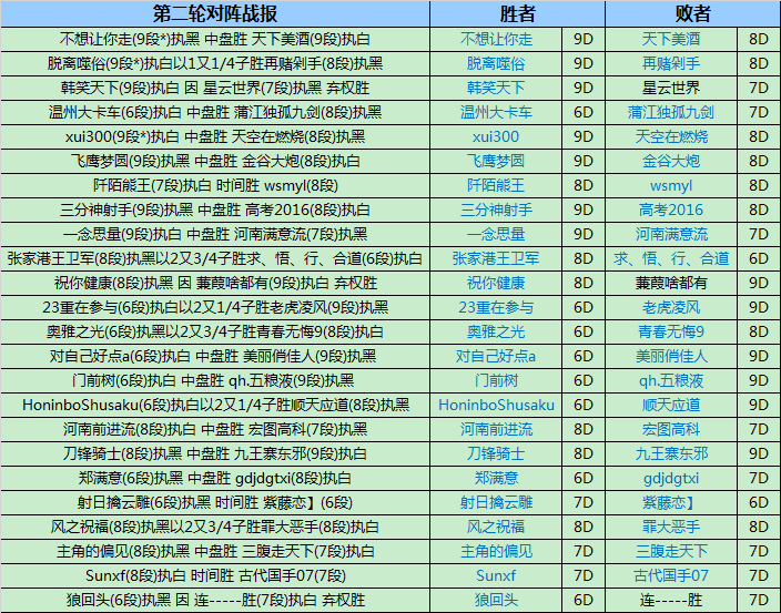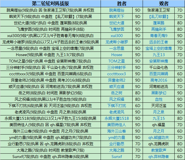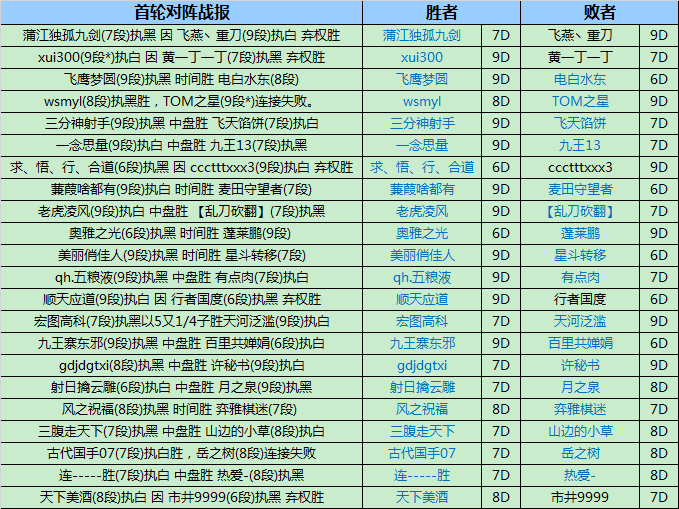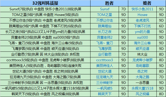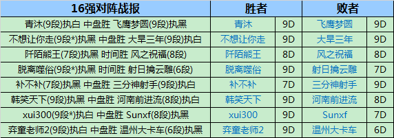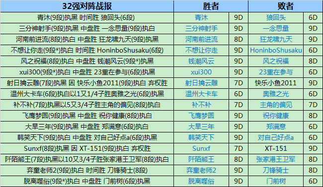 注意事项:每盘棋均为系统自动猜先。对局中掉线以后5分钟以内登陆上棋魂则对局继续,超过5分钟则判负。每局掉线5次则判负。胜负确定后原则上不允许续赛和重赛。(另:报名选手中等级分排名前8位的选手直接晋级32强赛。)