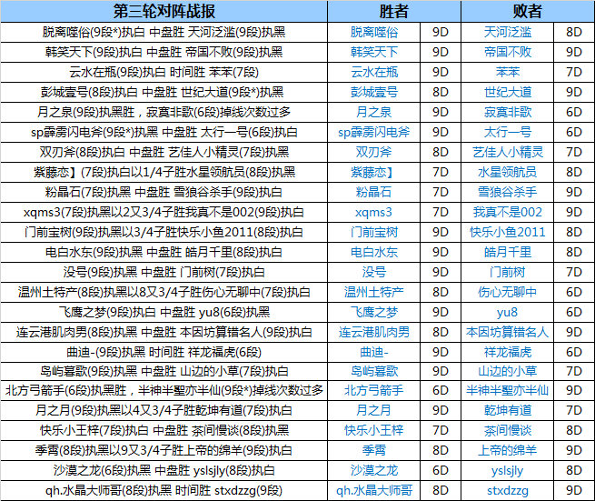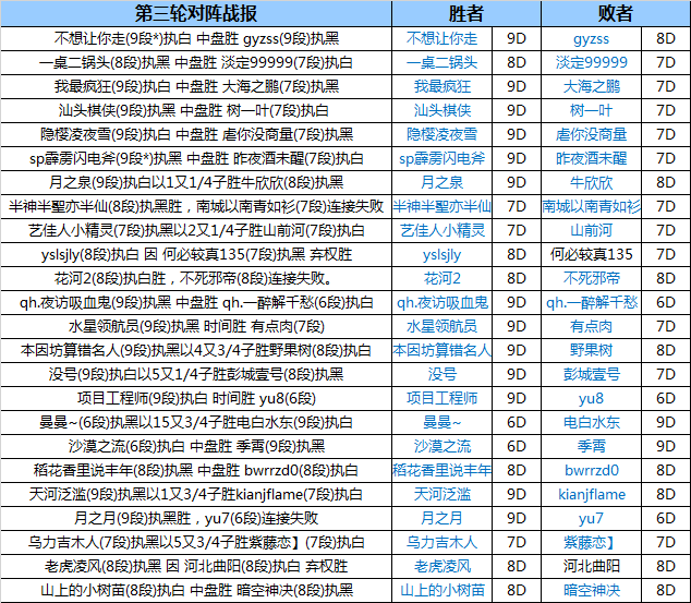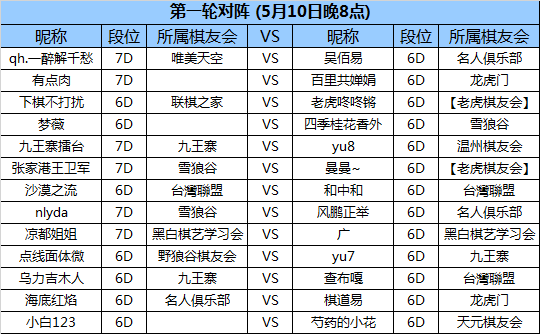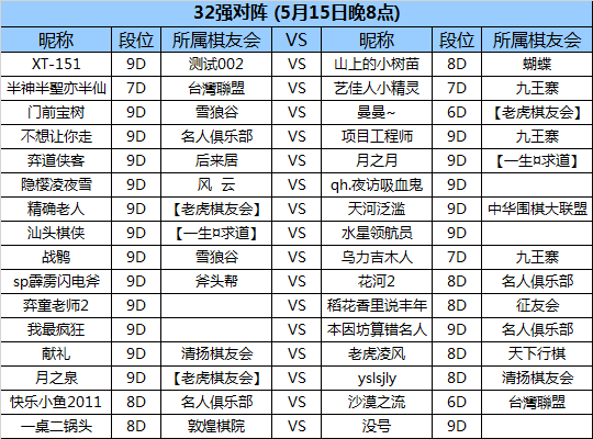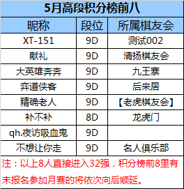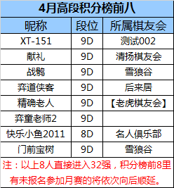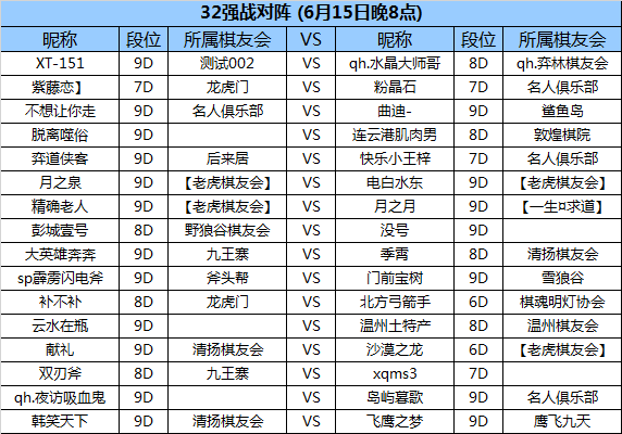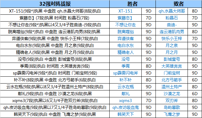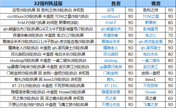 注意事项:每盘棋均为系统自动猜先。对局中掉线以后5分钟以内登陆上棋魂则对局继续,超过5分钟则判负。每局掉线5次则判负。胜负确定后原则上不允许续赛和重赛。(另:报名选手中等级分排名前8位的选手直接晋级32强赛。)