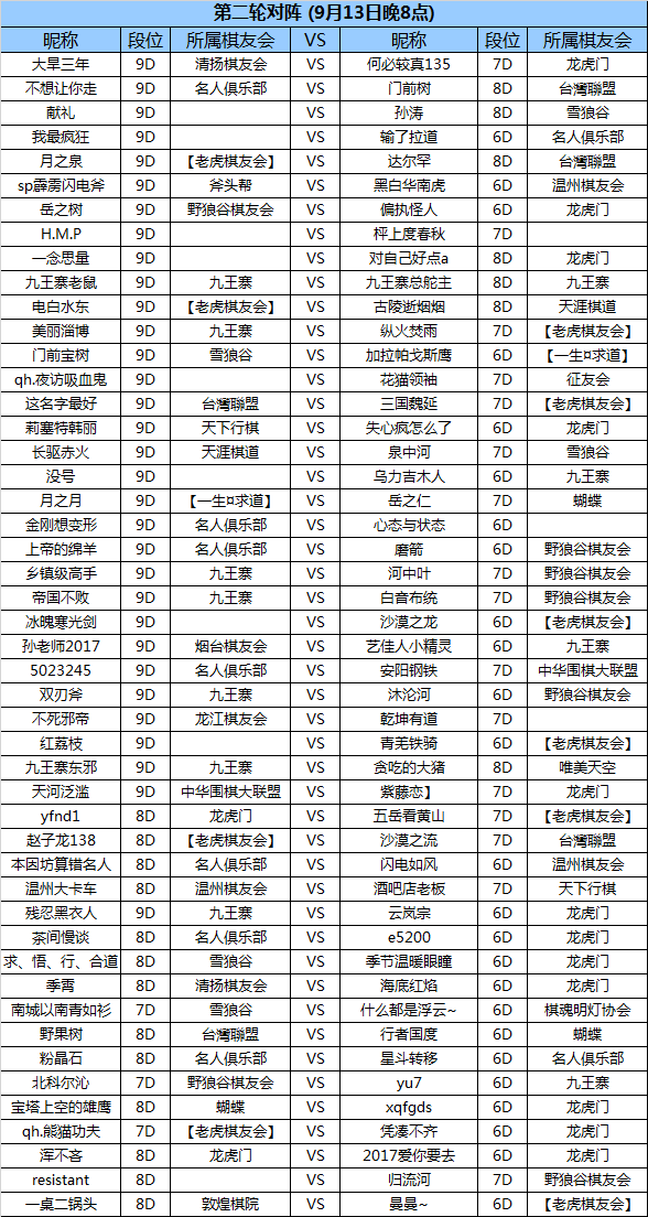 第二轮 9月13日 (周3)20:00 (第二轮)