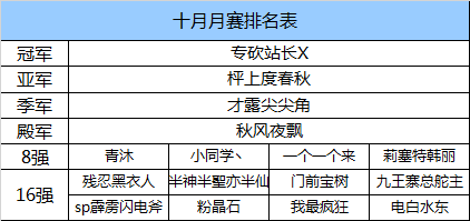 (每周二、周六、周日休战,因与个人赛时间冲突10月月赛时间改为每周一、三、五)