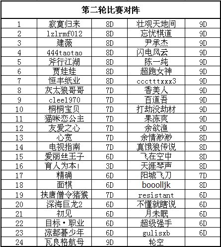 5月15日周三晚8点第二轮对阵人员名单