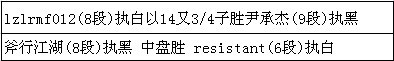 | lzlrmf012(8段)执白以1/4子胜斧行江湖(8段)执黑 |
