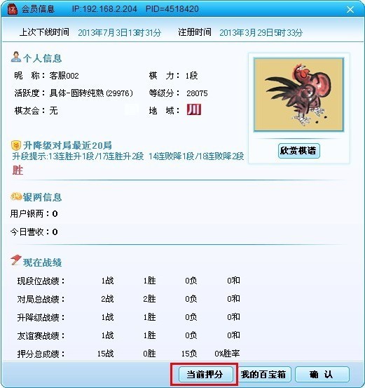 5、增加了查看自己在当前服务器的押分情况的功能。查看自己的个人信息,然后点击个人信息面板下房的“当前押分”按钮,即可通过弹出面板查看相关信息。
