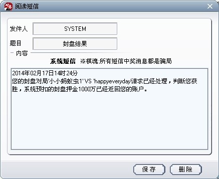 一方棋友发起封盘请求后,系统会自动预扣该棋友1000万银两封盘押金然后自动结束比赛,棋友可以离开当前房间。待客服上线后判定当前比赛胜负关系后,如果发起封盘请求的棋友获胜或者和棋,系统则会返还预扣的1000万银两押金;如果客服认定发起封盘的棋友是无理封盘或者判负的话,则不会返还预扣的1000万押金。