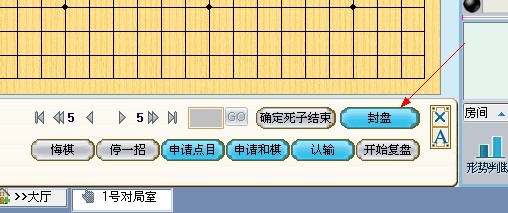 在棋友进行对局时,对局室的功能栏最右上角提供封盘按钮,以解决在客服不在线而遭遇耍赖,无法及时进行处理的情况。一方棋友发起封盘后,系统自动终止对局,双方棋友可以离开对局房间自由活动,等待客服上线以后对棋局进行判罚。