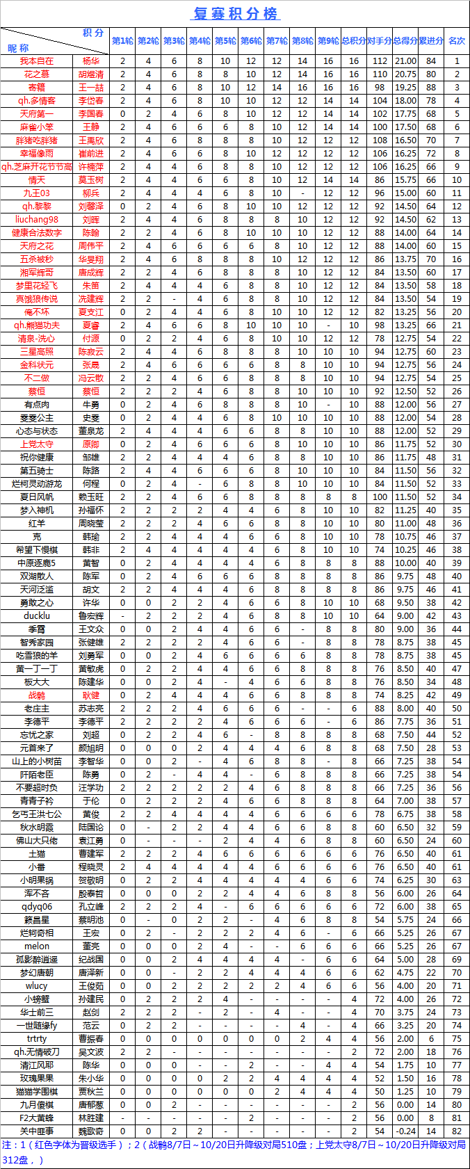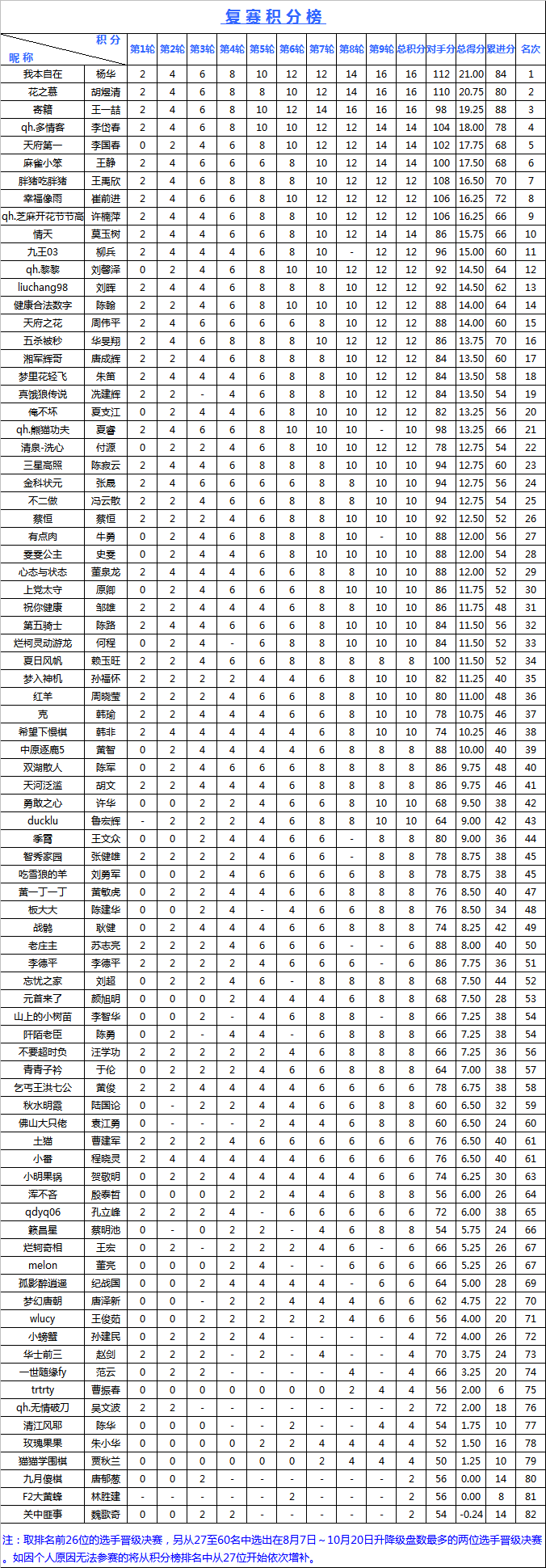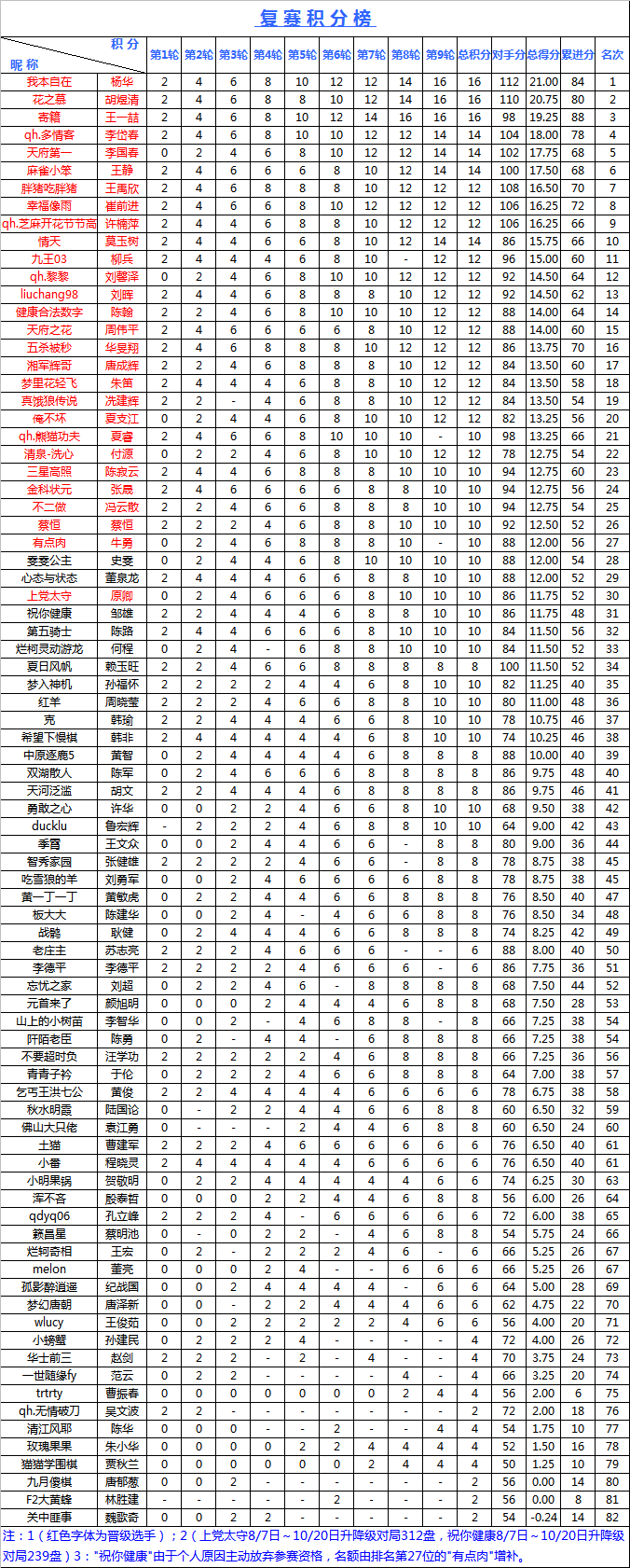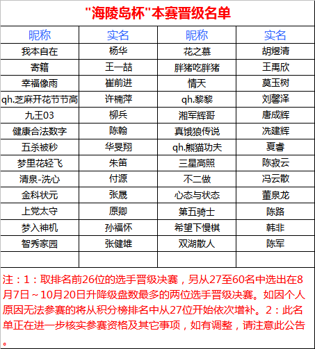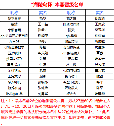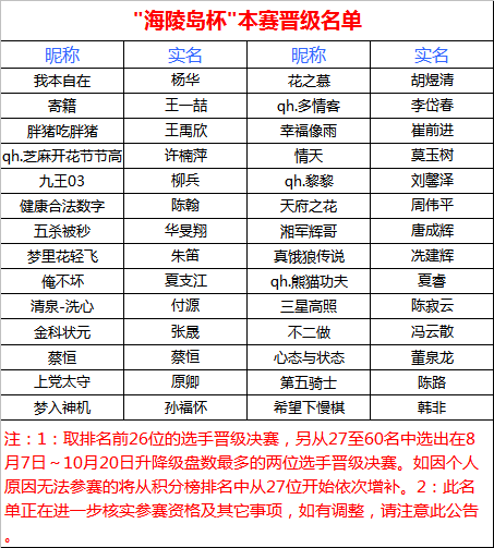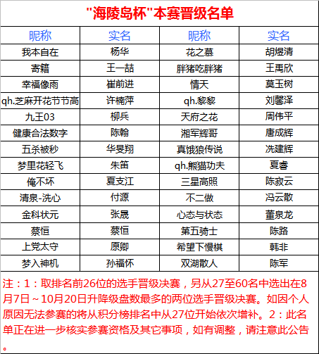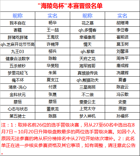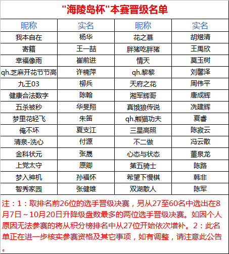 经过近一个月的紧张比赛昨晚"海陵岛杯"网络复赛最后一轮落下帷幕,9轮比赛结束后根据积分选出了排名前26的选手晋级最后的本赛,另外两个名额本应分别由8月7日至10月22日升降级最多且段位在7D以上选手获得。如因如因个人原因无法参赛的将从积分榜排名中从27位开始依次增补。这28位选手将参加2014年11月份在海陵岛皇冠大酒店举办的"海陵岛杯"中国业余围棋32强赛。报到时间后期将逐一通知,请晋级选手保持联系方式畅通。