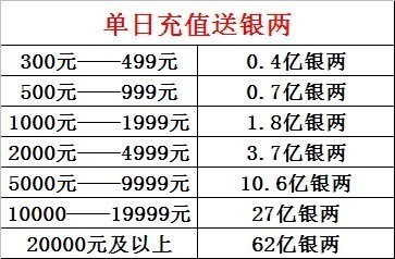 凡单日充值总额达到一定数额,我们在进行统计以后将对棋友进行相应的银两反馈,具体反馈形势如下: