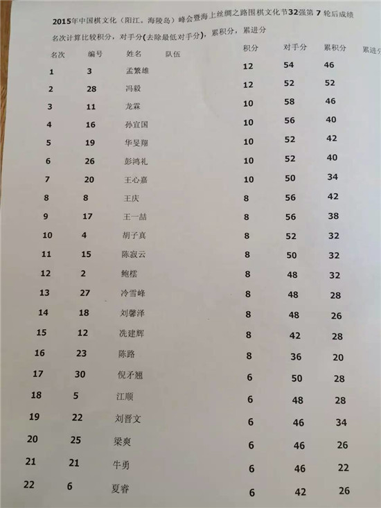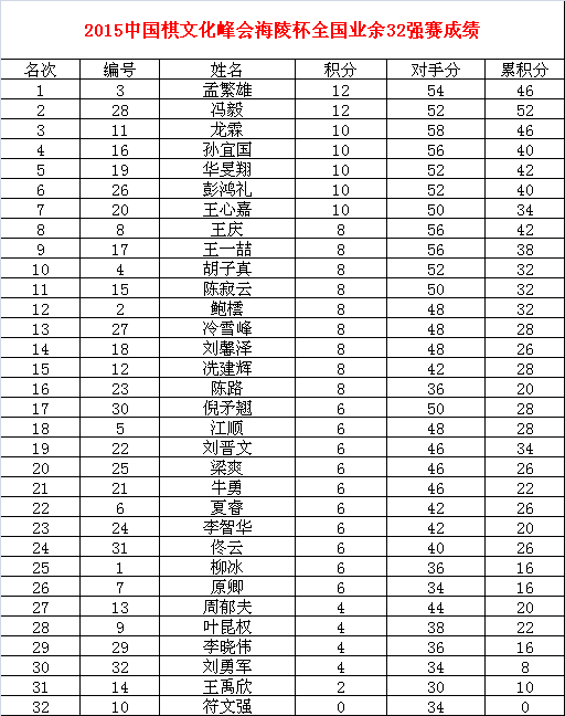 2015年中国棋文化(阳江,海陵岛)峰会暨海上丝绸之路围棋文化节中国业余32强公开赛于12月8日在广东省阳江市海陵岛收枰,本次比赛经过网选预赛、网选复赛及七轮本赛的激烈角逐,孟繁雄夺得个人冠军,冯毅获得亚军,龙霖获得季军。