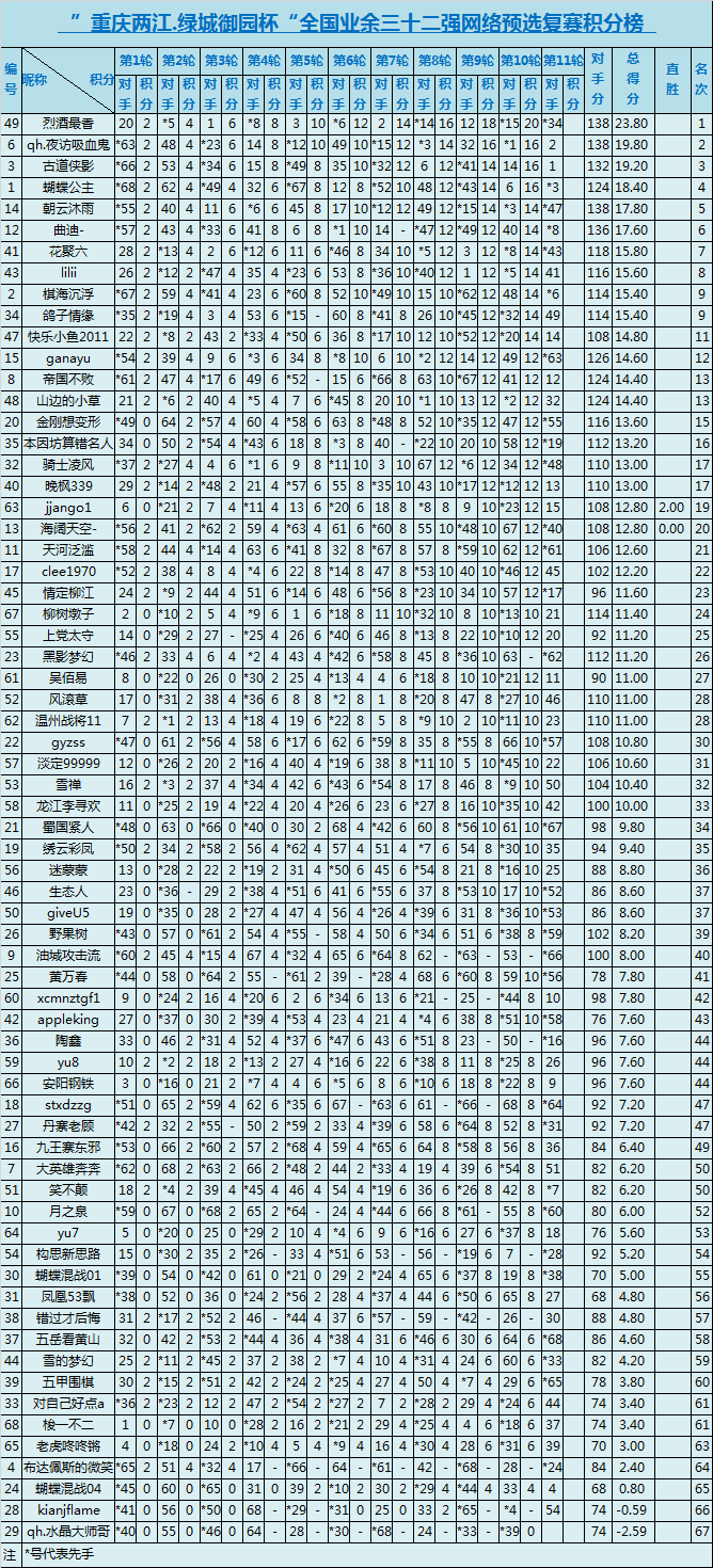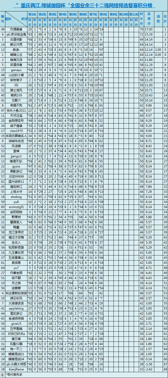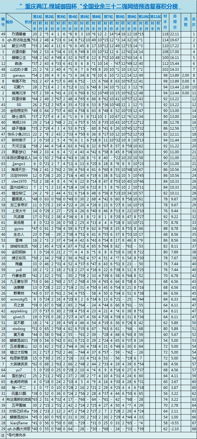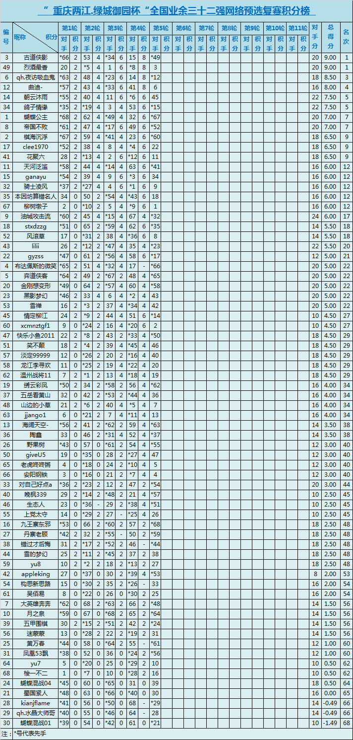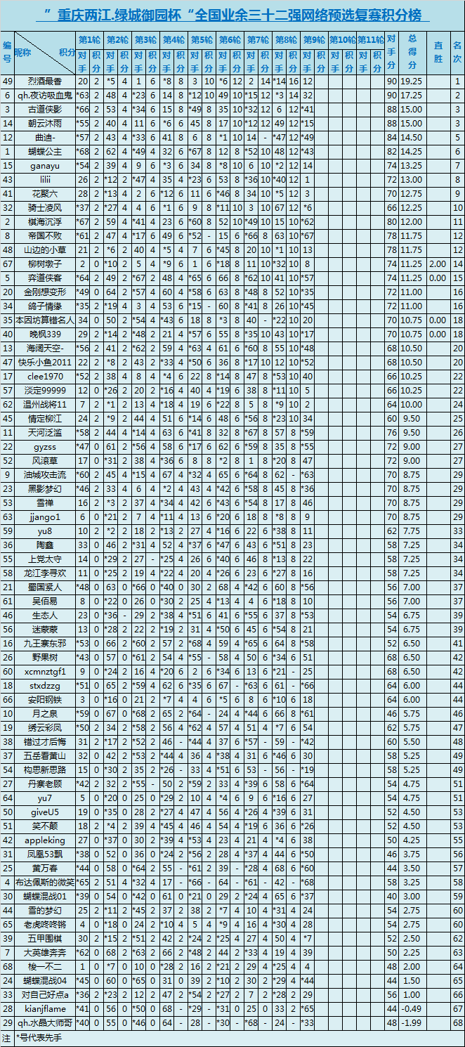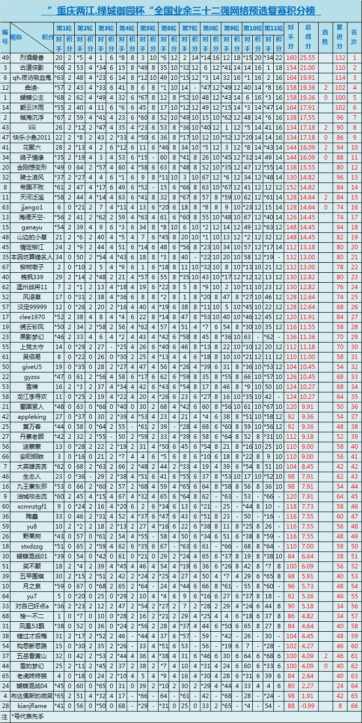 网选复赛共11轮,采用总得分排名,依总得分,积分,对手分,直胜,累进分确定最终名次。