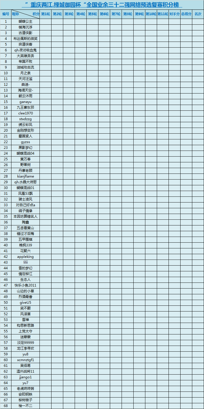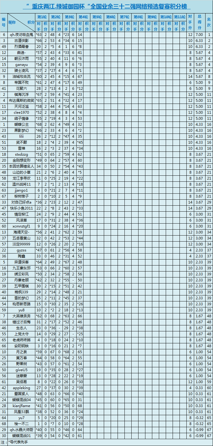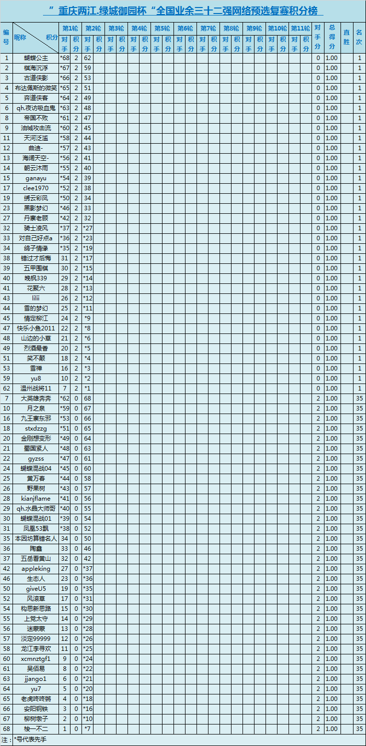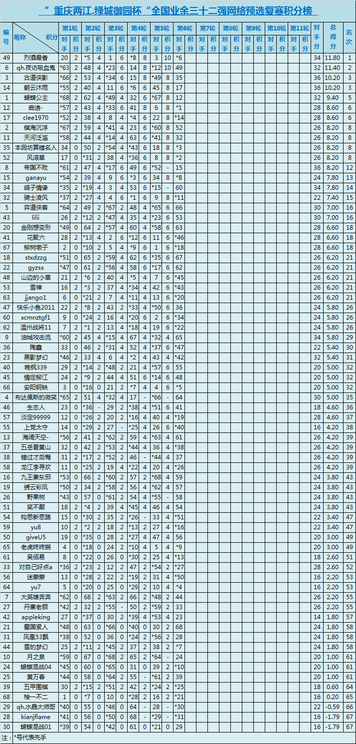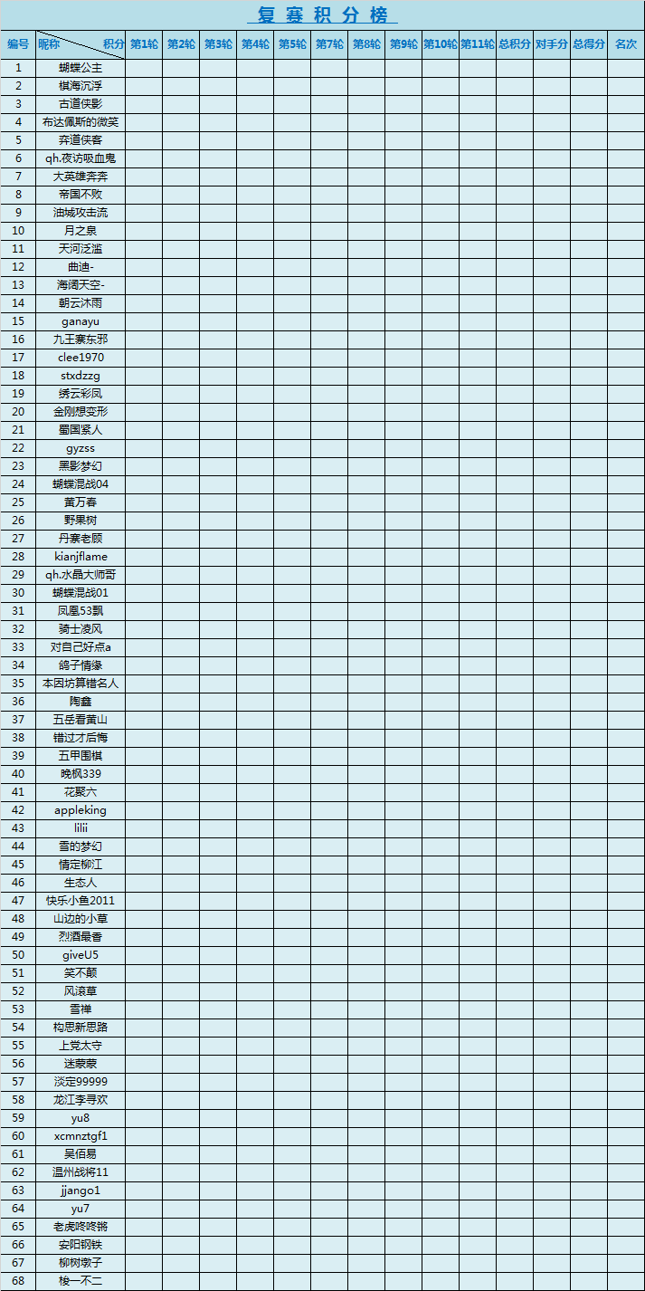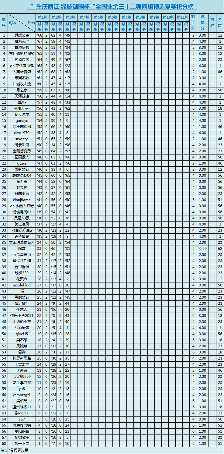 网选复赛共11轮,采用总得分排名,依总得分,积分,对手分,直胜,累进分确定最终名次。