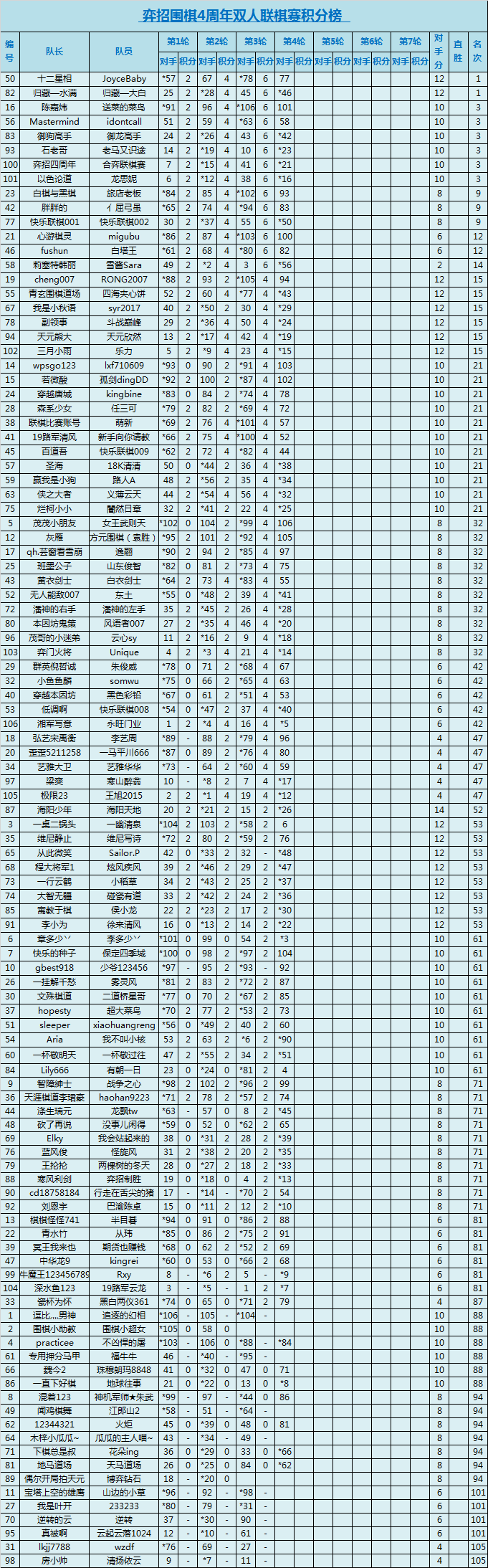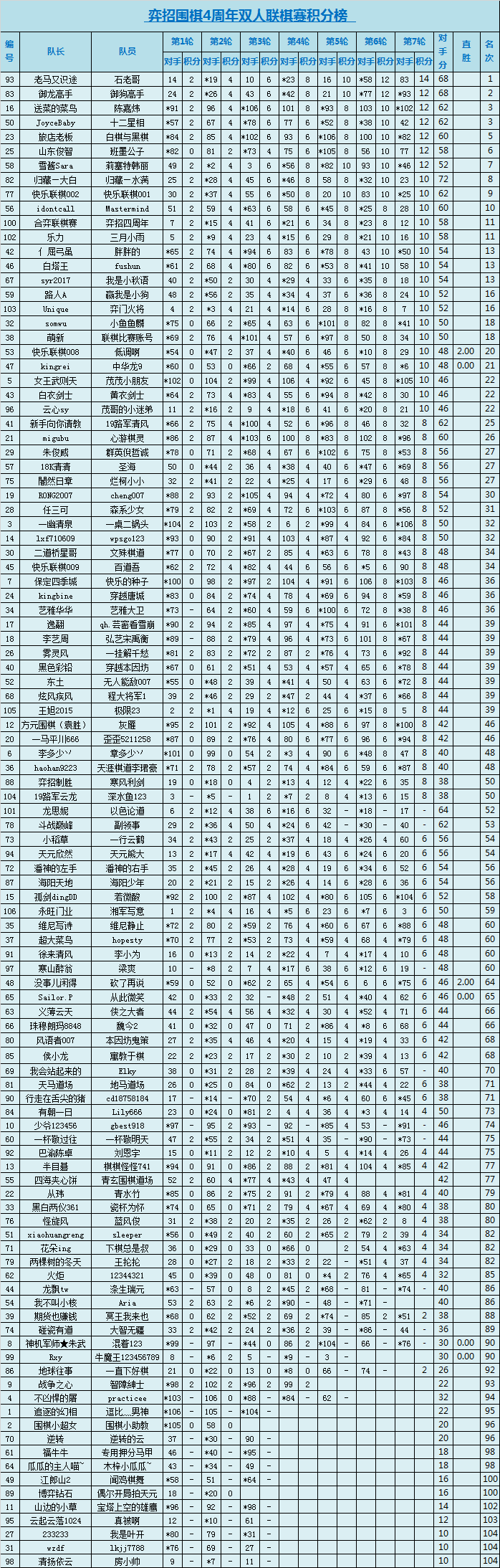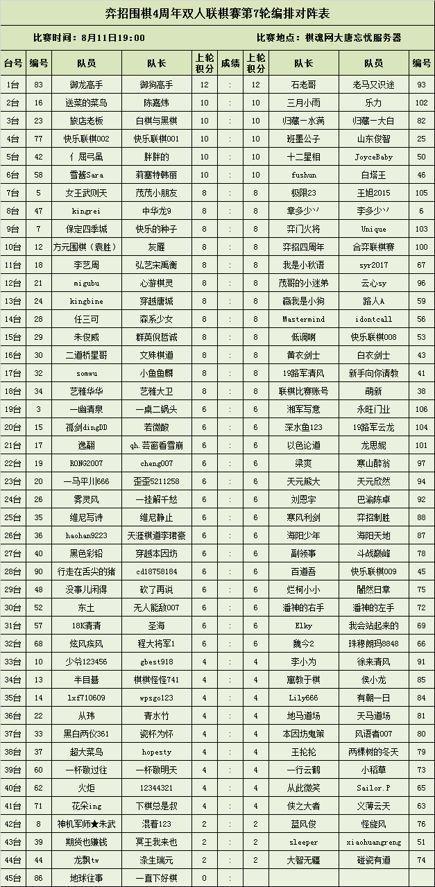 3、赛制为七轮积分循环赛;本次比赛采用电脑系统编排,积分排名,依大小分直胜确定名次。